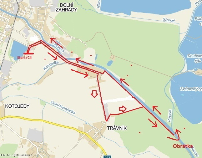 Jedná se o dvou okruhovou trať převážně po silnici a asi 10% tratě tvoří šotolina. Vzhledem k tomu, že jeden okruh měří 10548,75m je možnost zaběhnout pouze ¼ maraton pro ty otrlejší je připravena klasická ½ maratonová trať. Trať je rovinatá, vyměřena měřícím kolečkem a značena po 1km. Start a prezentace budou v loděnici u Bágráku (Hrubý rybník) v Kroměříži. Registrace od 9:00 hod a samotný start v 10:00 hod. Občerstvení (iont+voda) na 5.km,10.km,15.km a v cíli.
